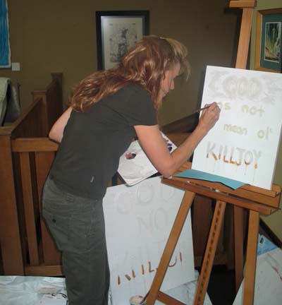 11/9 -- Lucy was invited to the GLAAD Garden Party this Sunday, but doesn't think she's going to be able to make it. However, she wanted to contribute something to their auction so she's designing a piece of slogan art. And here she is hard at work! ![]() Contents of this webpage ©2005 Lucille F. Lawless/Sharon Delaney |